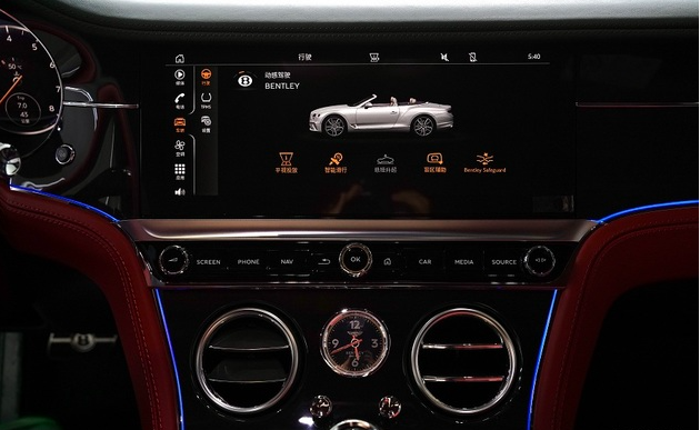 全新歐陸GTC采用了革新式“賓利三面翻轉中控面板”(Bentley Rotating Display)。初入車內,儀表板中央好像沒有屏幕一樣。按下發(fā)動機啟動按鈕,儀表板中央的飾面無聲滑動翻轉,呈現出一塊12.3英寸的中控屏。屏幕界面由賓利設計,菜單結構簡潔直觀、一目了然。