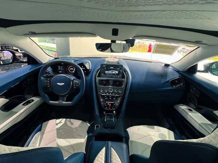 進入DBS 59內部可以發(fā)現(xiàn),整個內飾格調由黑色、棕色和綠色三種顏色構成,與外部賽車綠的車漆相呼應。可以明顯的看到,DBS 59雖熱配備了一塊懸浮式的中控顯示屏,但和大多數(shù)跑車一樣,仍保留了大量的物理按鍵,保證了純粹的駕駛感。