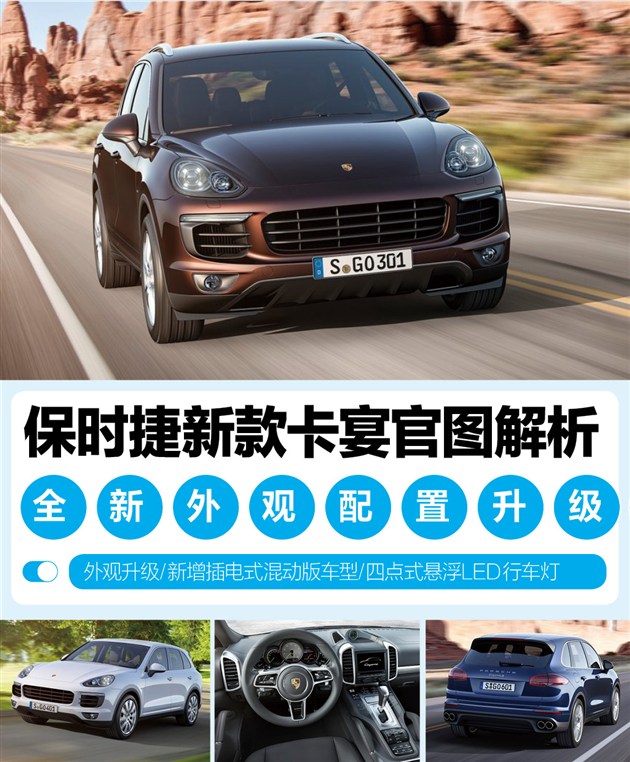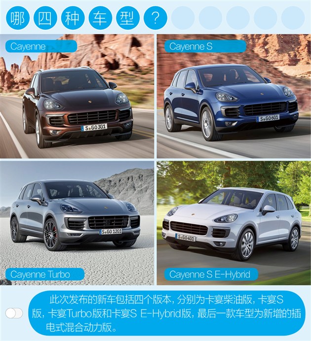 此次發(fā)布的新車包括四個版本,分別為卡宴柴油版、卡宴S版、卡宴Turbo版和卡宴S E-Hybrid版,其中卡宴S E-Hybrid是繼Panamera S E-Hybrid和918之后推出的第三款插電式混動車型。