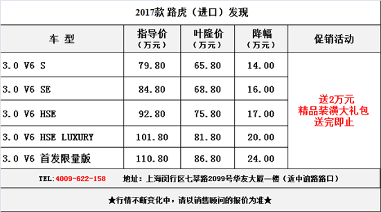 近日,筆者從上海地區(qū)經(jīng)銷商葉信名車了解到,目前路虎發(fā)現(xiàn)五優(yōu)惠高達(dá)24萬元,購車另送價(jià)值2萬元裝潢大禮包。為廣大新老客戶提供:汽車裝潢、舊車置換、購車按揭貸款、代辦驗(yàn)車、上牌、保險(xiǎn)等最資深,最專業(yè)的服務(wù)。