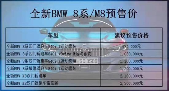 日前,全新BMW 8系及M8轎跑車正式開啟預售,新車預售97萬元起,新車定位大型GT跑車,同步推出硬頂版和敞篷版,搭載4.4T V8動力。上海葉信汽車現已接受預訂,首批名額有限,訂車即可享受超值好禮級搶先體驗8系的駕駛樂趣。